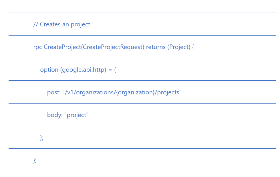 该 proto 遵循面向资源的设计理念,抽象出组织(organization)和项目(project),并按 /v1/organizations/{organization}/projects/{project} 的方式组织资源。