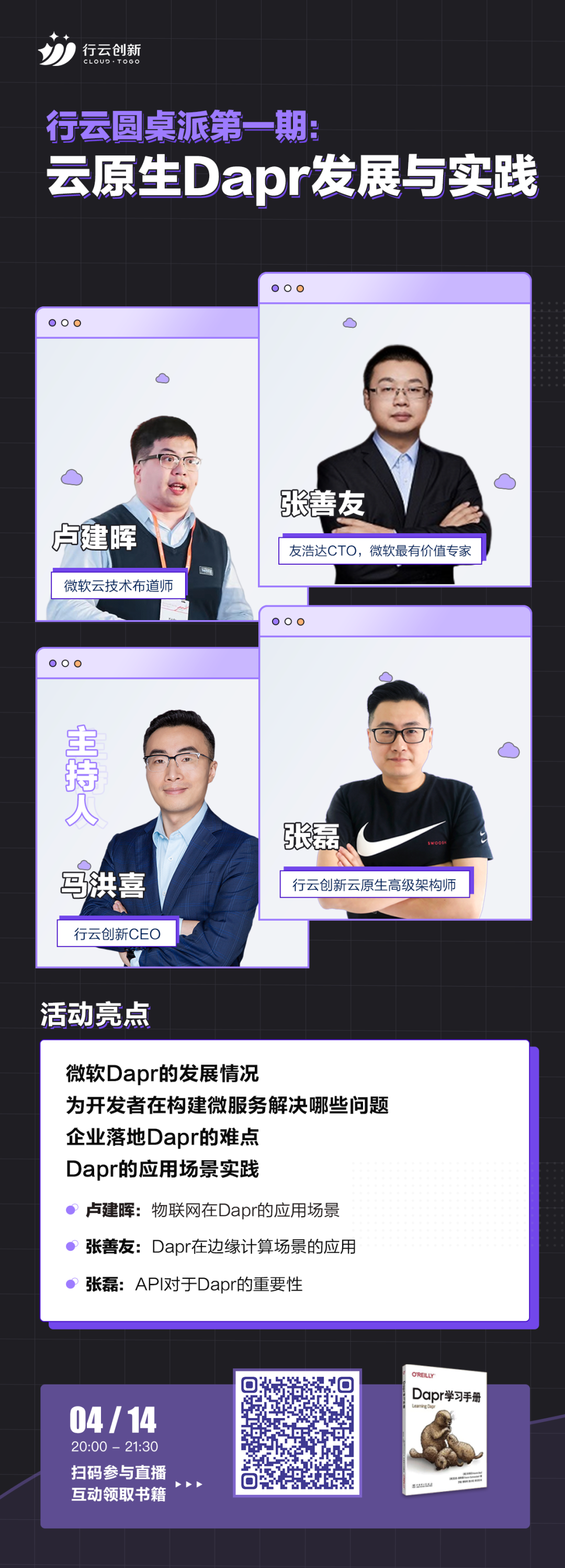 4月14日晚上8点,《行云圆桌派第一期:云原生Dapr的发展与实践》直播来啦!活动由开元体育创新CEO马洪喜,微软最有价值专家、.NET技术专家张善友,微软云技术布道师卢建晖,开元体育创新云原生架构师张磊四位嘉宾与大家聊聊Dapr的发展情况和落地遇到的问题、Dapr应用场景实践、未来展望等。