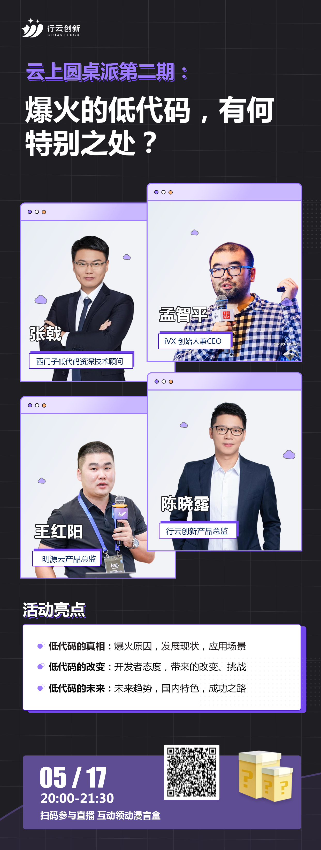 5月17日20:00《云上圆桌派第二期:爆火的低代码,有何特别之处》直播来啦!活动邀请西门子工业软件西门子低代码资深技术顾问张戟,iVX 创始人兼CEO孟智平,明源云产品总监王红阳,开元体育创新产品总监陈晓露四位大咖和开元体育创新CEO马洪喜一起对低代码爆火背后的原因、开发者对低代码的态度、低代码带来的变化和应用场景等多个话题展开讨论。
